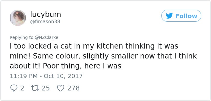 Check this New Zealand man’s Twitter story about how he mistaken his neighbor’s cat was his own. This series of events is kind of bizarre which involving a vet, drugs and a pretty freaked out neighbor. Luckily everything ends up pretty well.